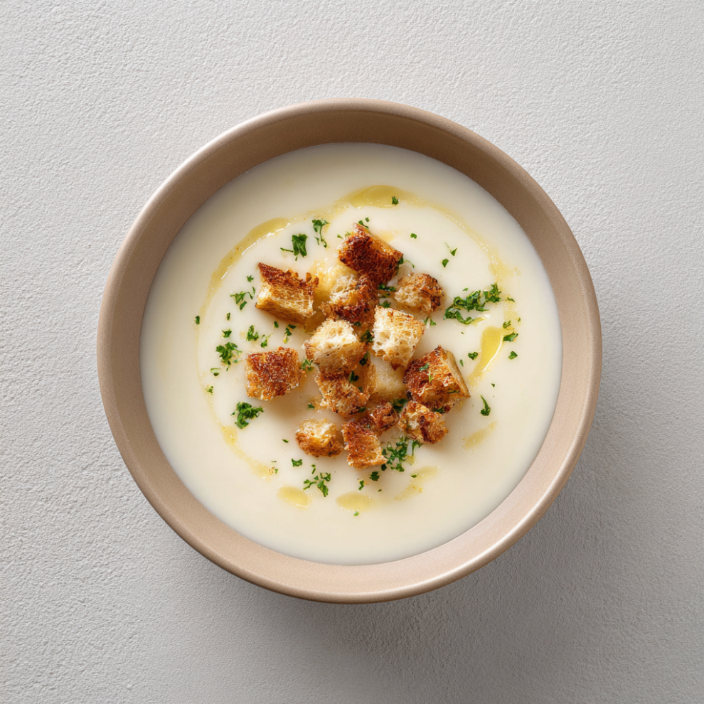 Картофельный крем-суп с гренками и трюфельным маслом.