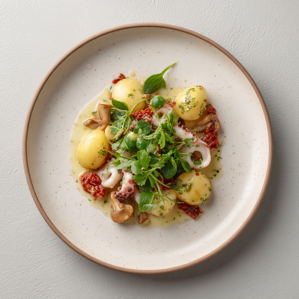 Салат с подкопчённым кальмаром, бейби картофелем, жаренными вешенками и вяленными томатами. Заправляем сладким соусом и украшаем кинзой и семечками.