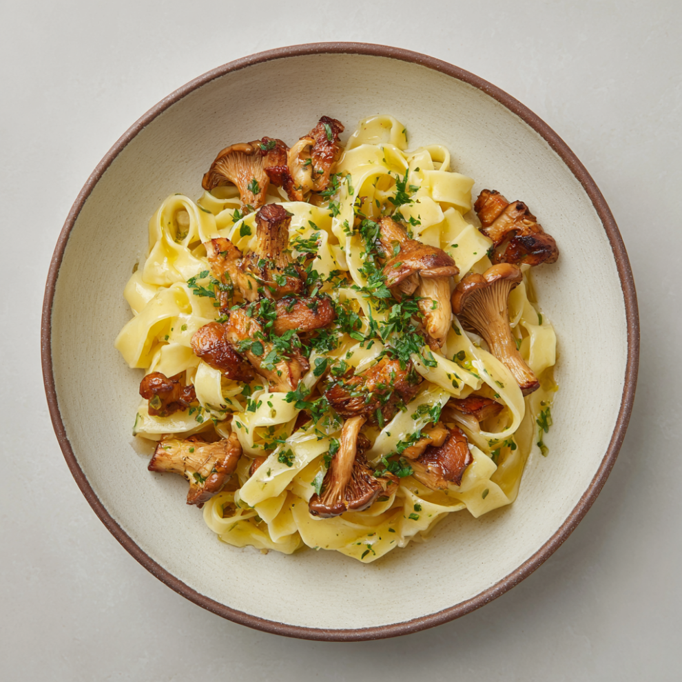 Паста, приготовленная вручную, с обжаренными грибами, луком-шалотом и чесноком. Сверху трюфельное масло